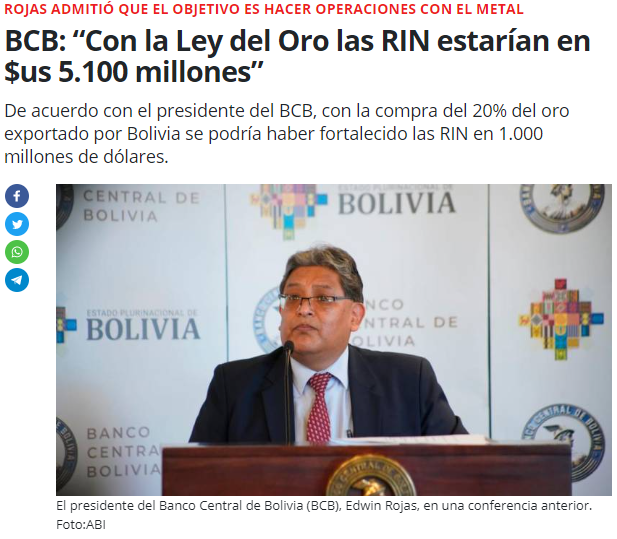 #Bolivia | Pocas cosas son más patéticas que ver al BCB justificando la liquidación del oro físico. Dice que si Ley del Oro se promulgaba en 2021, hoy las reservas hubieran subido $5.100 millones, pero no dice que antes se farrearon $12.000 sin límite de gasto ni de deuda. https://t.co/98hmh0osgP