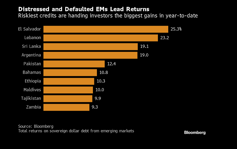 #ElSalvador | Los bonos soberanos emergentes con mayor riesgo. El país de Bukele encabeza la lista por encima de Argentina, Pakistán o Zambia, y se ubica al borde del default. «Ah pero está acabando con las maras». https://t.co/k4SV0JDWCR