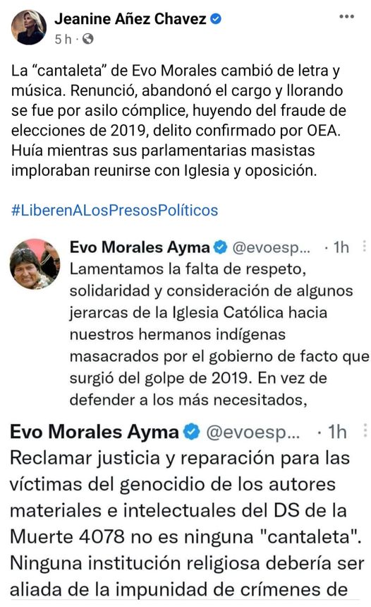 Añez dice que Evo en 2019 «huía mientras sus parlamentarias masistas imploraban reunirse con la Iglesia y oposición»