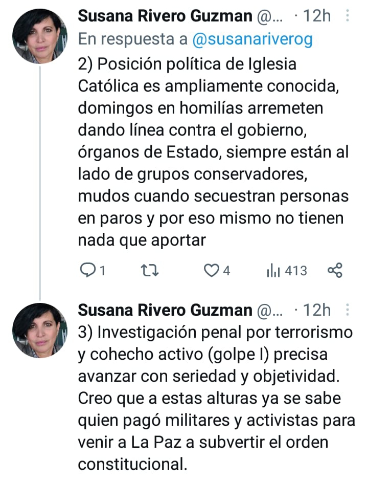 La exministra Susana Rivero dice que el Procurador, Wilfredo Chávez, sólo busca titulares al solicitar que se convoque a declarar a los miembros de la Conferencia Episcopal Boliviana (CEB), en el caso “Golpe I”.