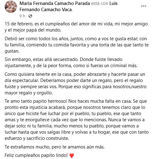 «Deberíamos poder darte un regalo, pero el regalo fuiste y siempre seras vos», le dice su hija a Camacho por su cumpleaños