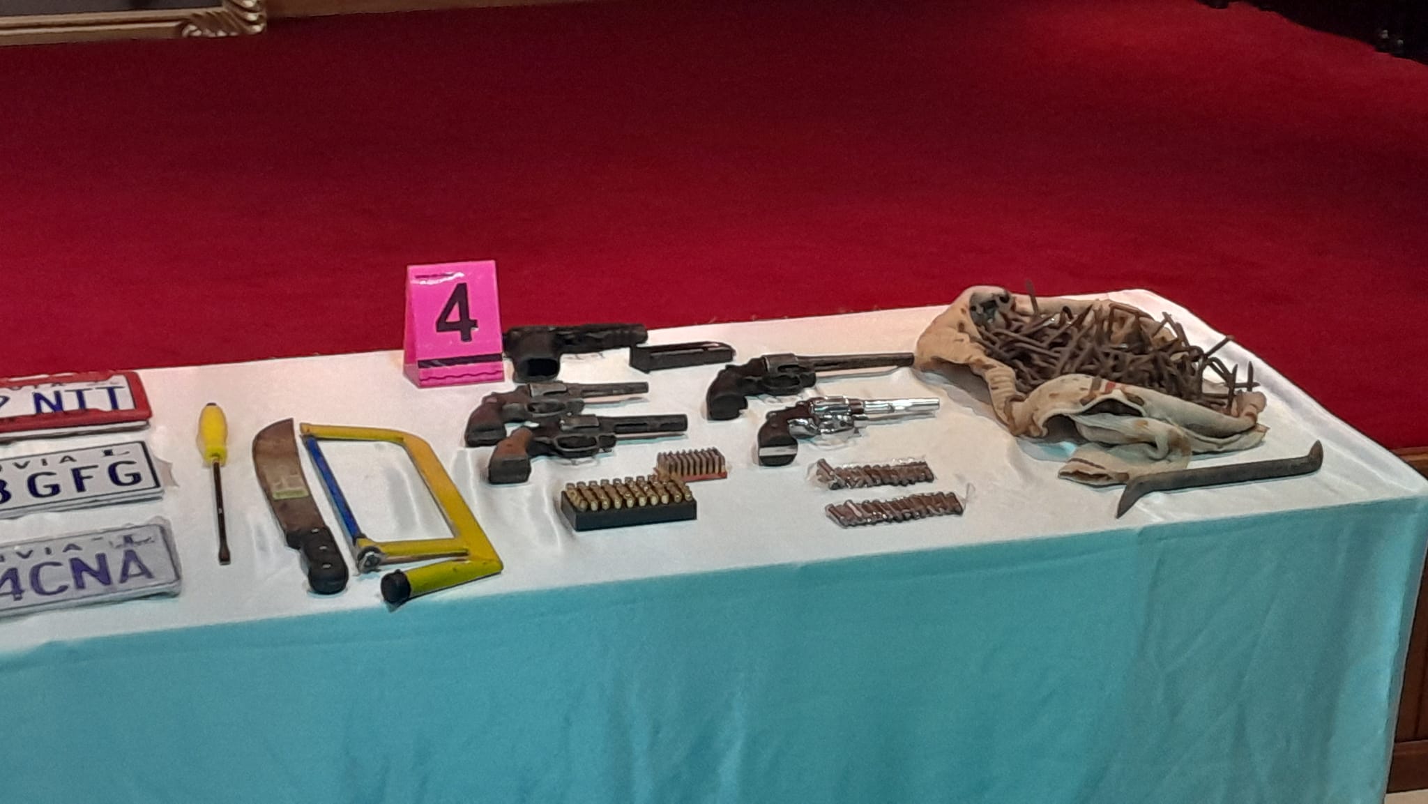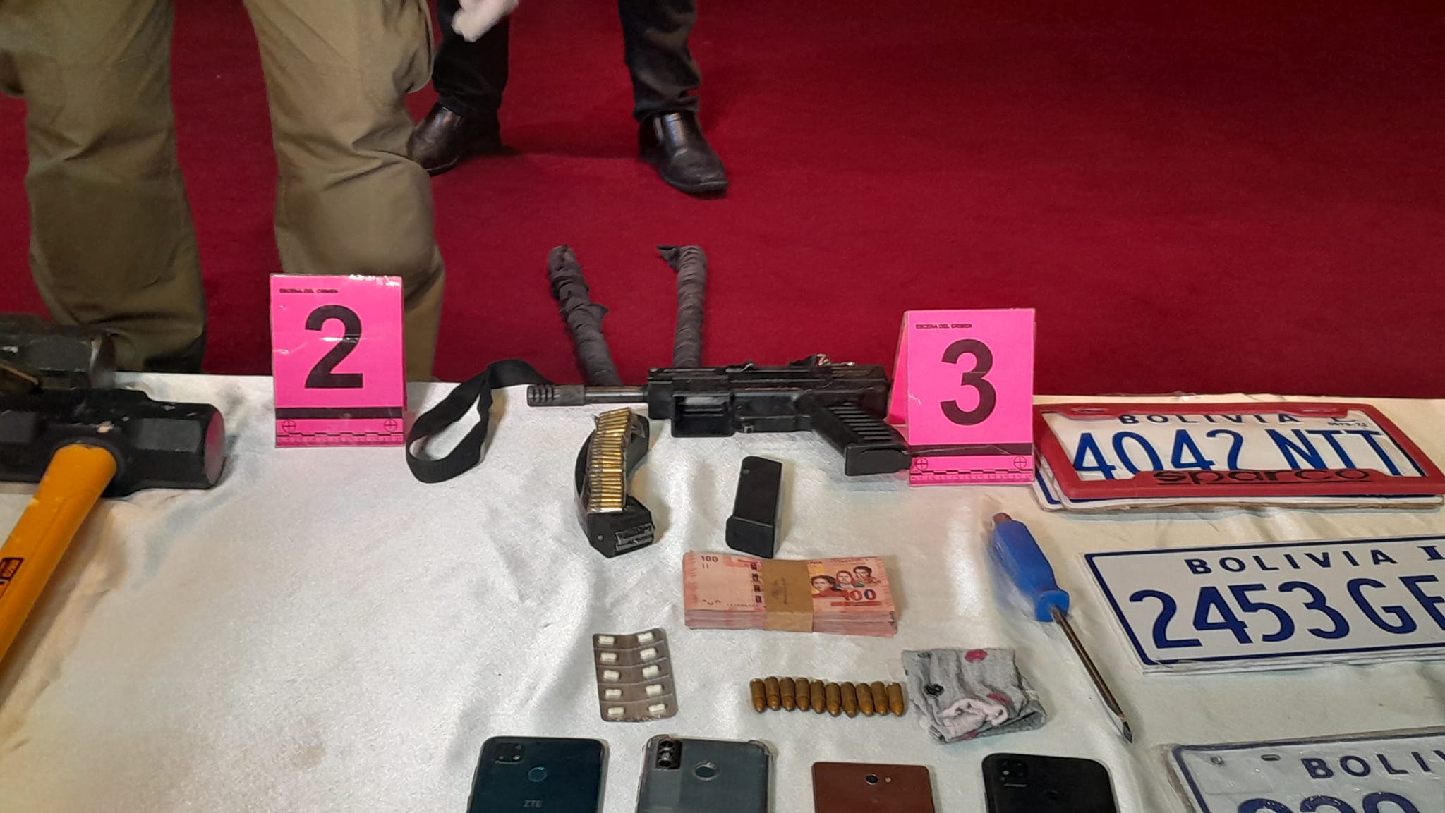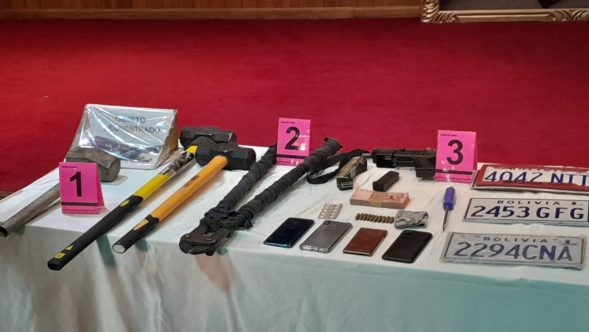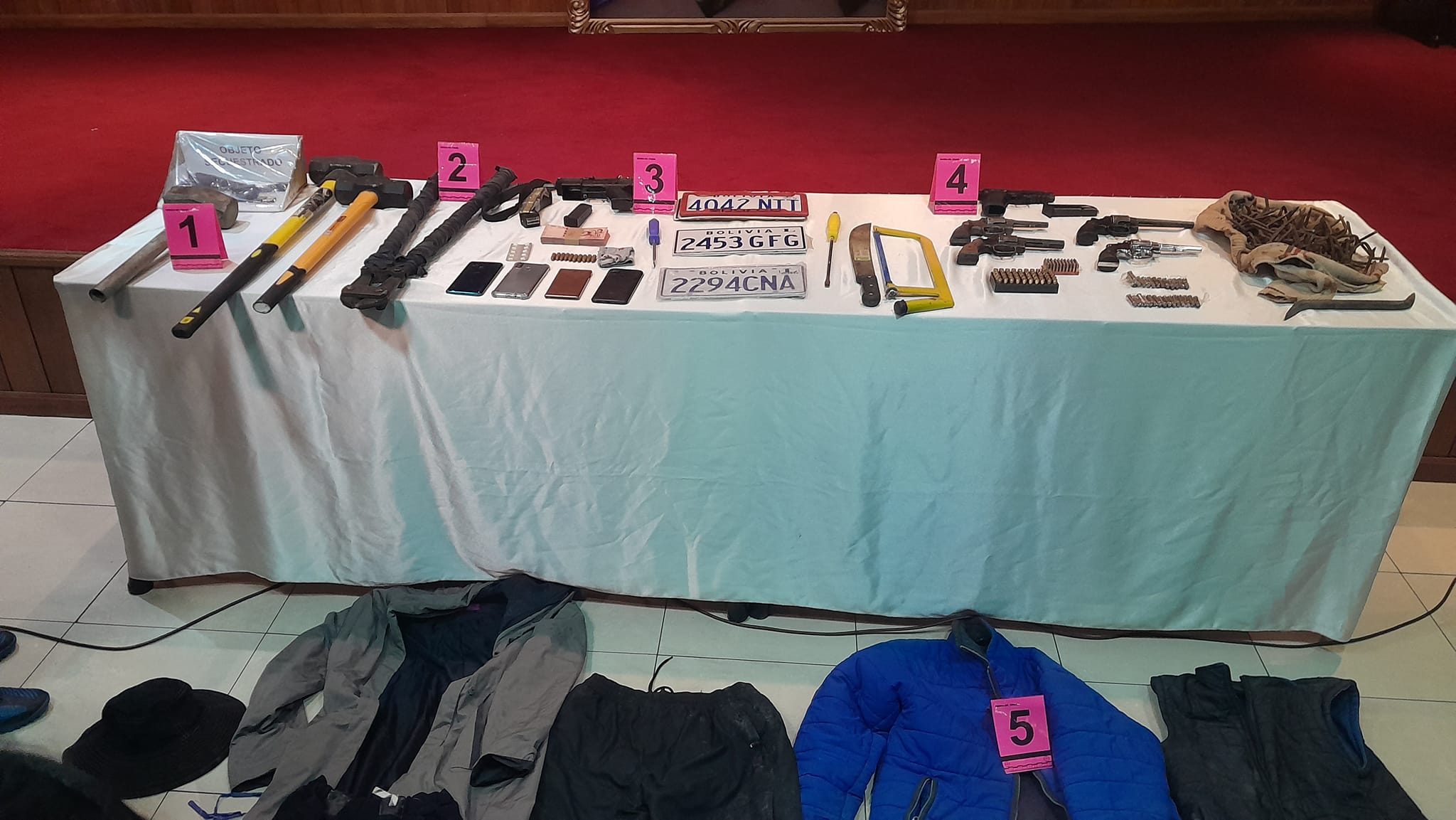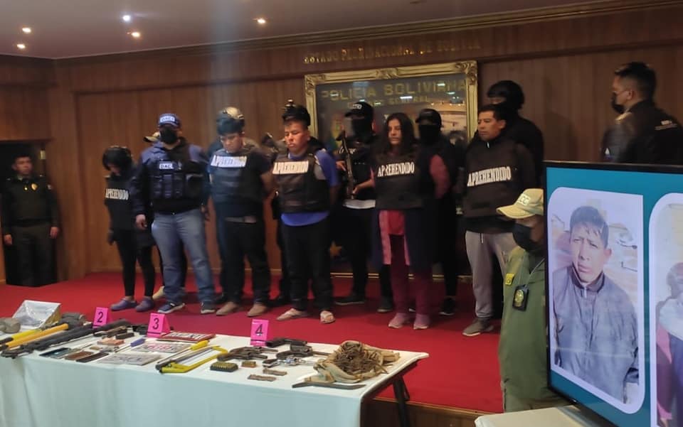 #LaPaz Ministro de gobierno presenta 5 aprehendidos por atraco a 2 casas de cambio en El Alto éste pasado jueves de donde se llevaron bs. 200.000, también se expuso las 6 armas que utilizaron para intimidar a los funcionarios y vecinos, habrían otros 5 antisociales implicados prófugos y uno de los aprehendidos estaba en la cárcel y recién había salido libre.