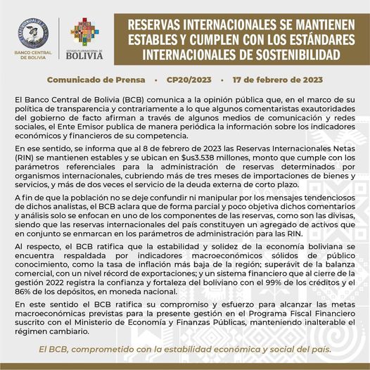 Banco Central de Bolivia asegura que al 8 de febrero del año 2023 las Reservas Internacionales Netas se mantienen y ubican en $us. 3,538.