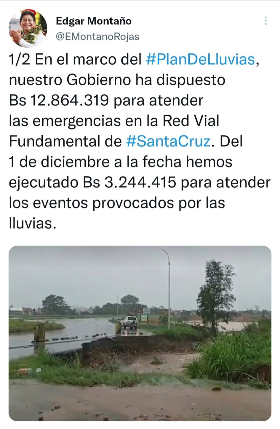 Gobierno ejecutó Bs. 3.244.415 de Bs. 12.864.319 que dispuso dentro del «Plan de Lluvias» para atender las emergencias en la Red Vial Fundamental de #SantaCruz.