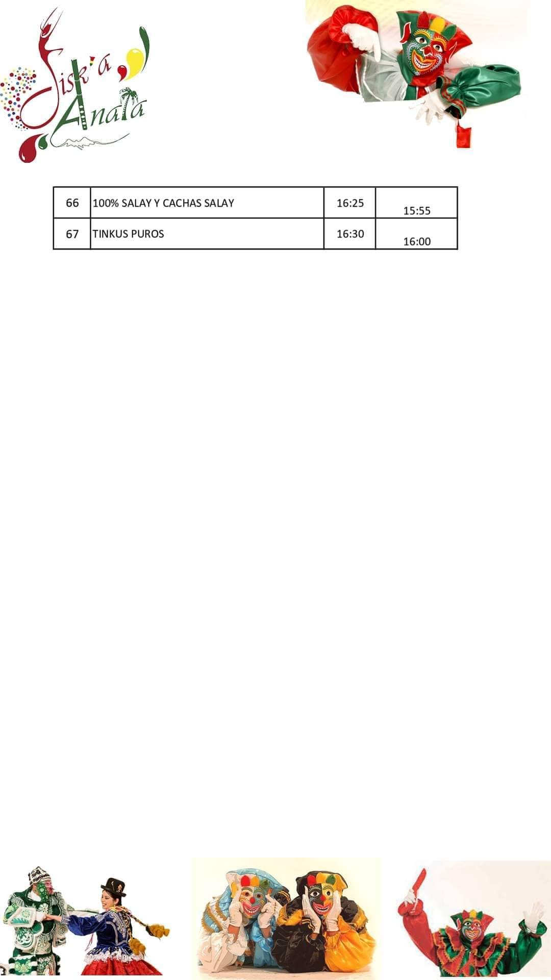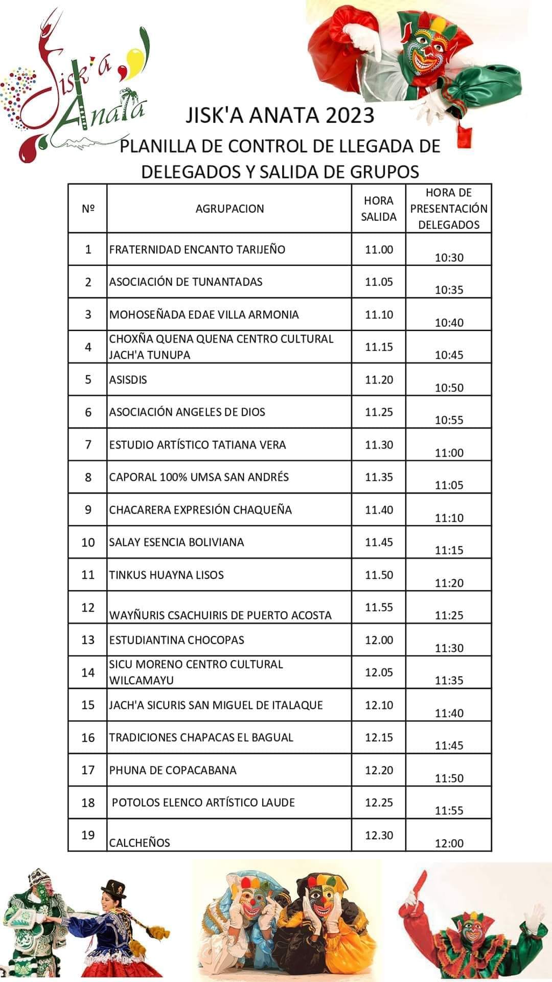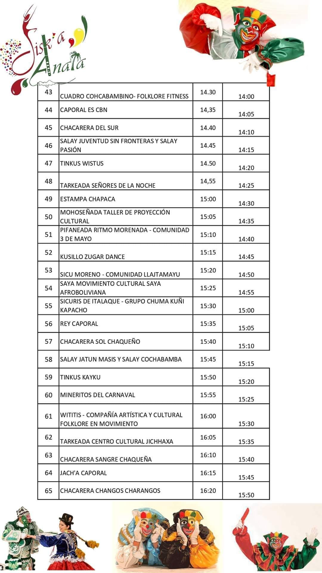 Este es el rol de la Entrada del Jisk’a Anata 2023, parte del Carnaval Paceño. Son más de 60 comparsas con diversas danzas representantes de la cultura boliviana. Se estima que la actividad culmine pasando a las 18:00 horas.