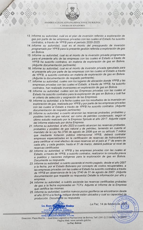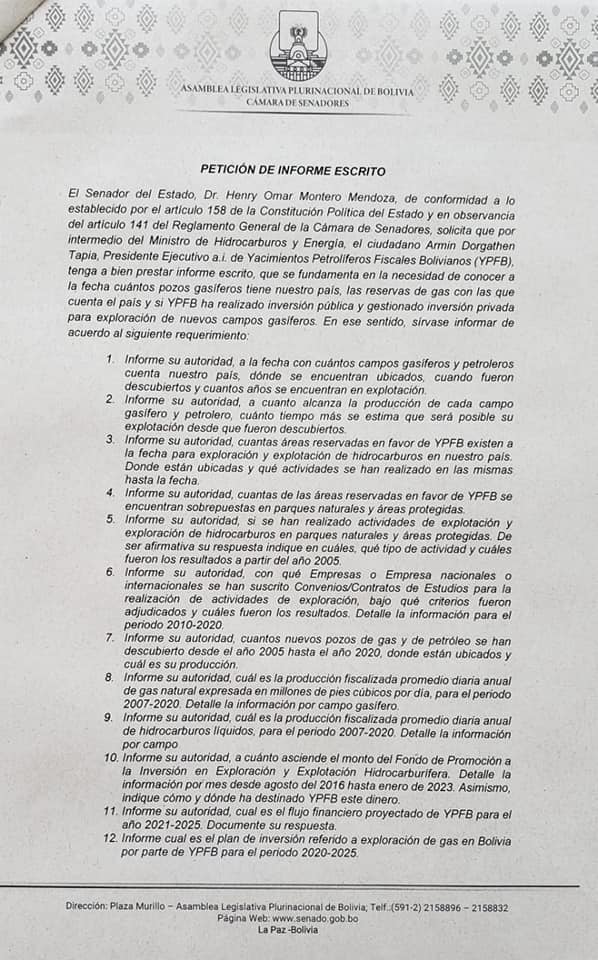En la Petición de Informe Escrito, solicitado por Montero, destacan las preguntas sobre la cantidad de los campos gasíferos y petroleros, la cantidad de producción, las áreas reservadas en favor de YPFB, la exploración y descubrimiento de nuevos campos, las inversiones en exploración y explotación, las reservas probadas, probables y posibles, el pago por costos de recuperación y otros.