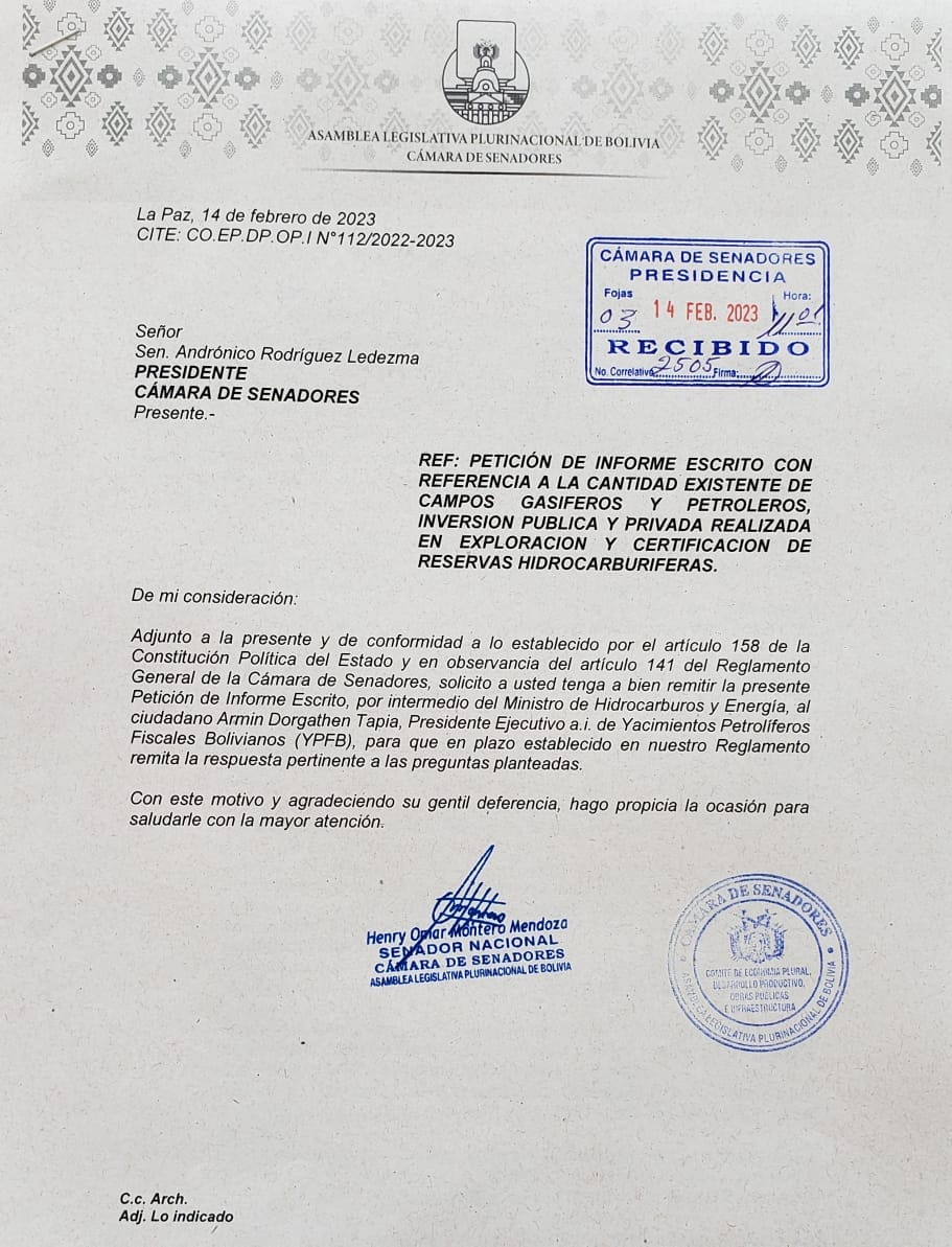 El jefe de la Bancada de Creemos, senador Henry Montero, informó que solicitó información al presidente interino de Yacimientos Petrolíferos Fiscales Bolivianos (YPFB), Armin Dorgathen Tapia, sobre la certificación de las reservas probadas y probables, totalidad de los campos gasíferos y petroleros, las inversiones públicas y privadas en exploración hidrocarburíferas en el país.
