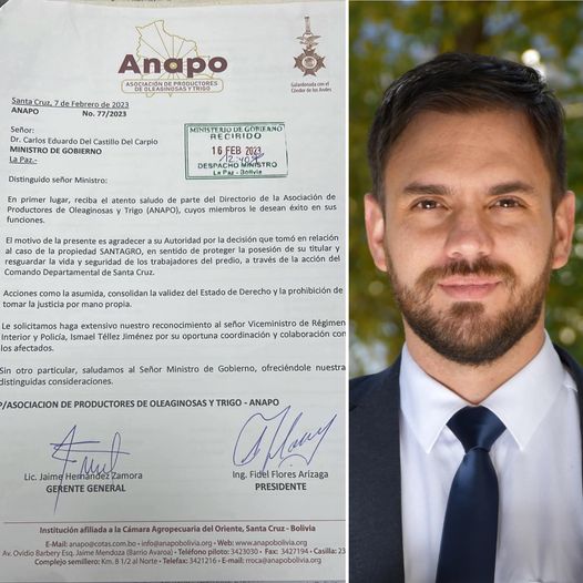 #Anapo agradeció al Ministro de Gobierno, Eduardo del Castillo por las acciones contra avasallamientos en la propiedad agrícola ‘SantaAgro’, la autoridad agradeció el reconocimiento en sus redes sociales.