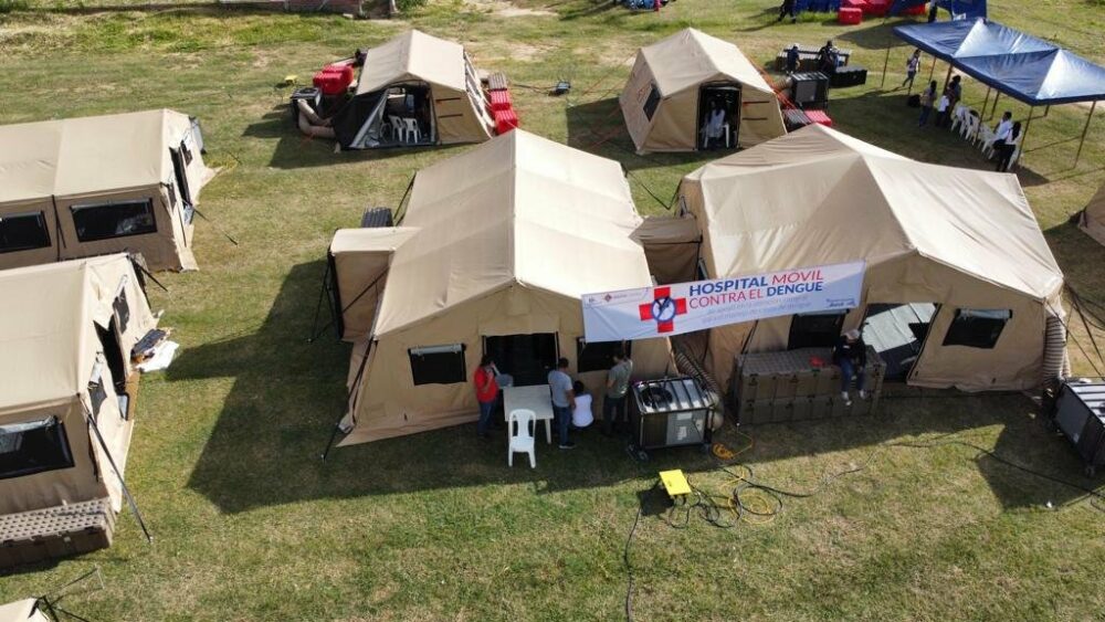 Desplegamos un hospital móvil para el triaje de casos con dengue; contamos con diagnóstico y tratamiento sintomático de esta enfermedad. El centro cuenta con 40 camas de internación y médicos para la atención integral de casos en #SantaCruz. https://t.co/WKNefAOi3Y