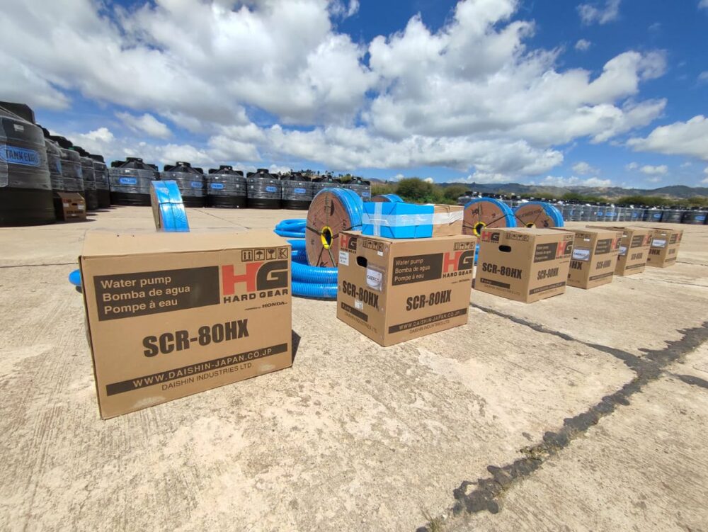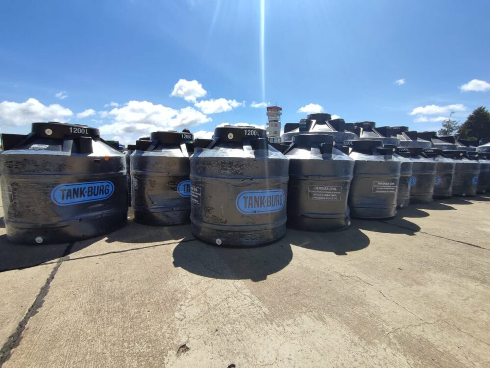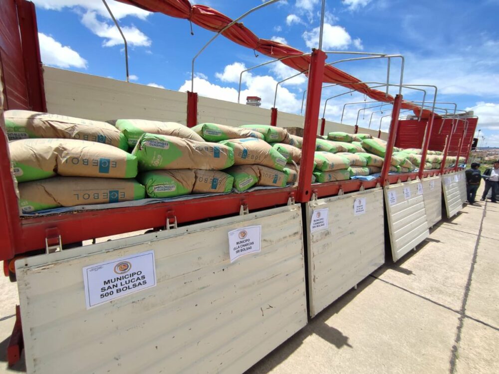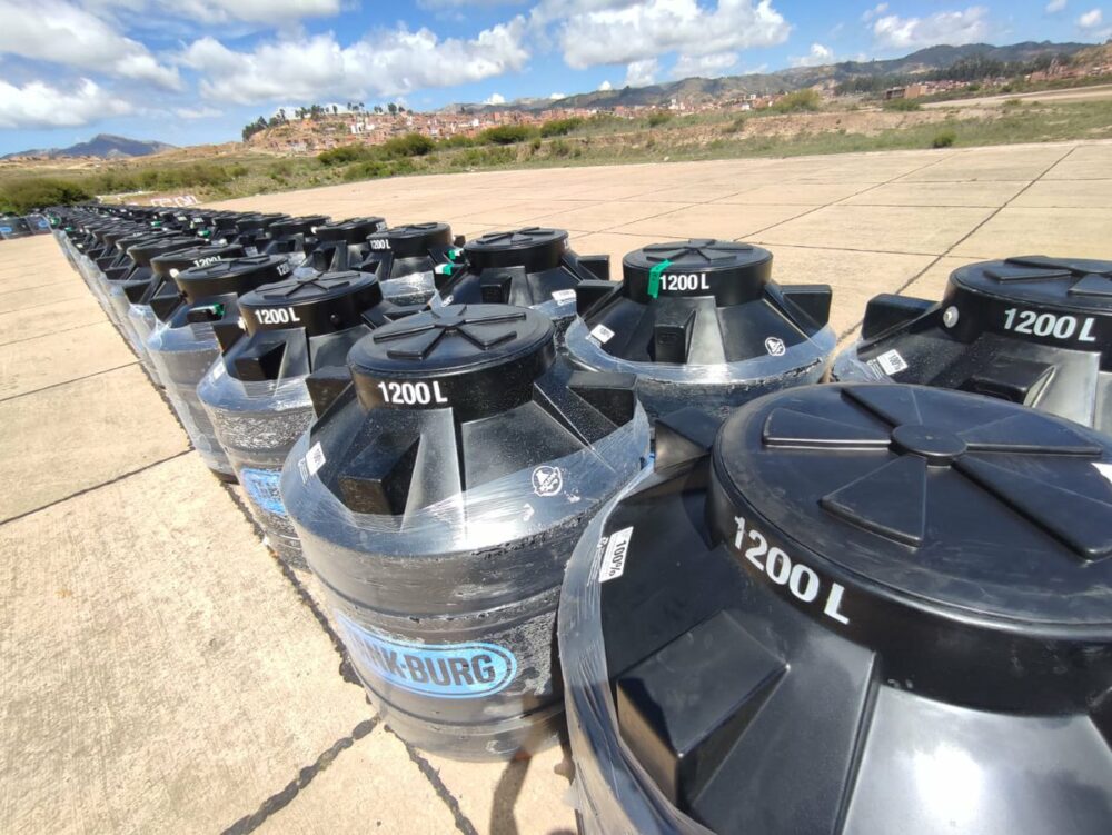 Con una inversión de Bs1,1 millones, hoy entregamos 340 tanques de agua, 6.795 bolsas de cemento, 3.120 pastillas potabilizadoras, 20 geomembranas y 9 motobombas a 26 municipios afectados en #Chuquisaca. https://t.co/oVnonTVl66