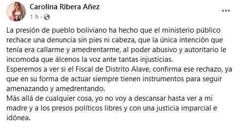 «Yo no voy a descansar hasta ver a mi madre y a los presos políticos libres y con una justicia imparcial e idónea», expresó Carolina Ribera, hija de la expresidenta, Jeanine Añez.