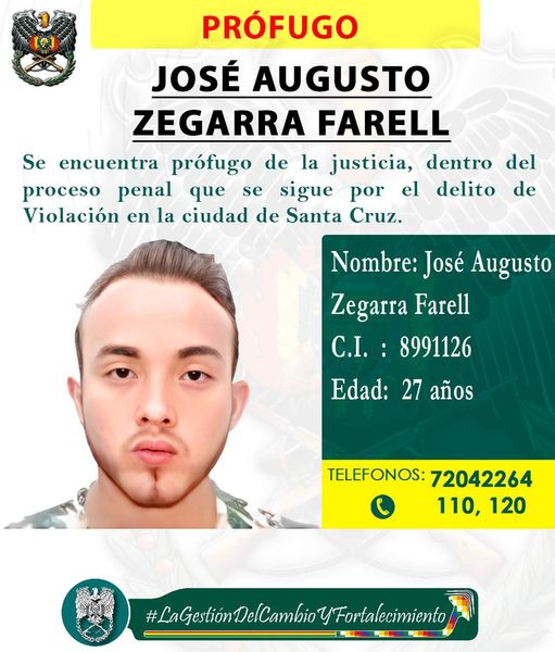Santa Cruz. El director de la FELCV mostró la fotografía de José Augusto Zegarra Farrel, quien se encuentra prófugo; es buscado por el delito de violación a una mujer taxista que hace servicios de In Drive. La Policía Boliviana se encuentra movilizada en busca de este joven de quien se conoce tiene antecedentes policiales y es consumidor de sustancias controladas. La Policía puso a disposición su número telefónico para la persona que tenga datos de su paradero.
