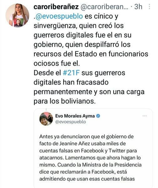 Hija de Añez llama «cínico» a Evo por negar que en su gobierno se crearon los «guerreros digitales»