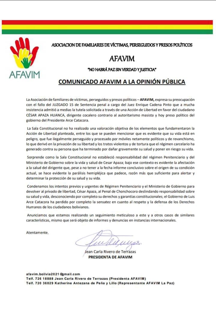 AFAVIN expresa respaldo y preocupación sobre el caso del cocalero César Apaza y su estado de salud