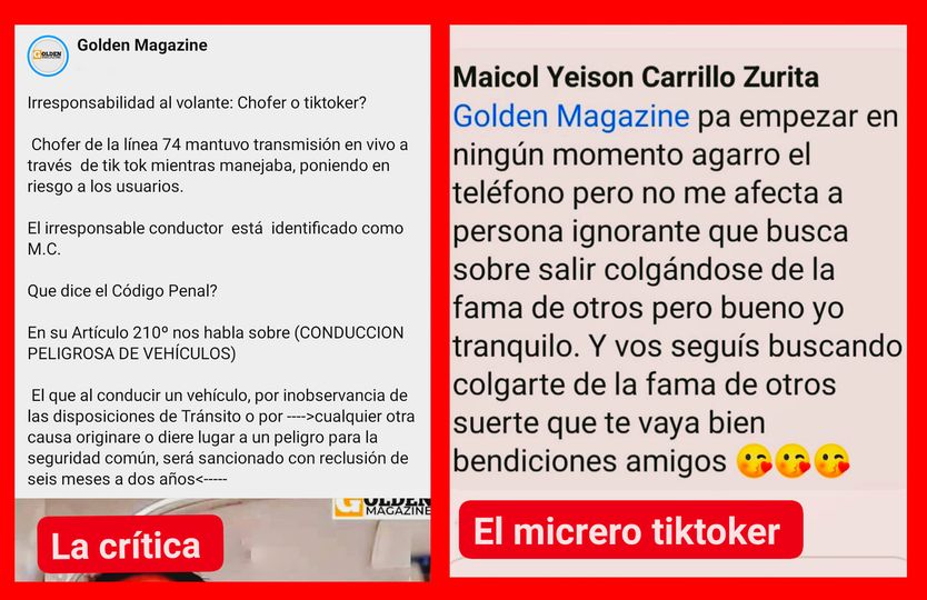 Tras la observación de Golden Magazine GM al manejo peligroso del micrero 🚍 – mientras lleva pasajeros tiktokea – Maicol Yeison Carrillo Zurita respondió «pa empezar en ningún momento agarro el teléfono»