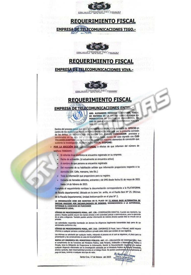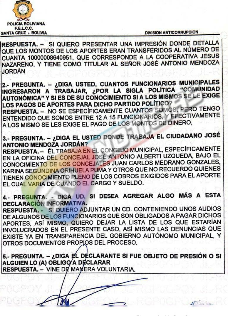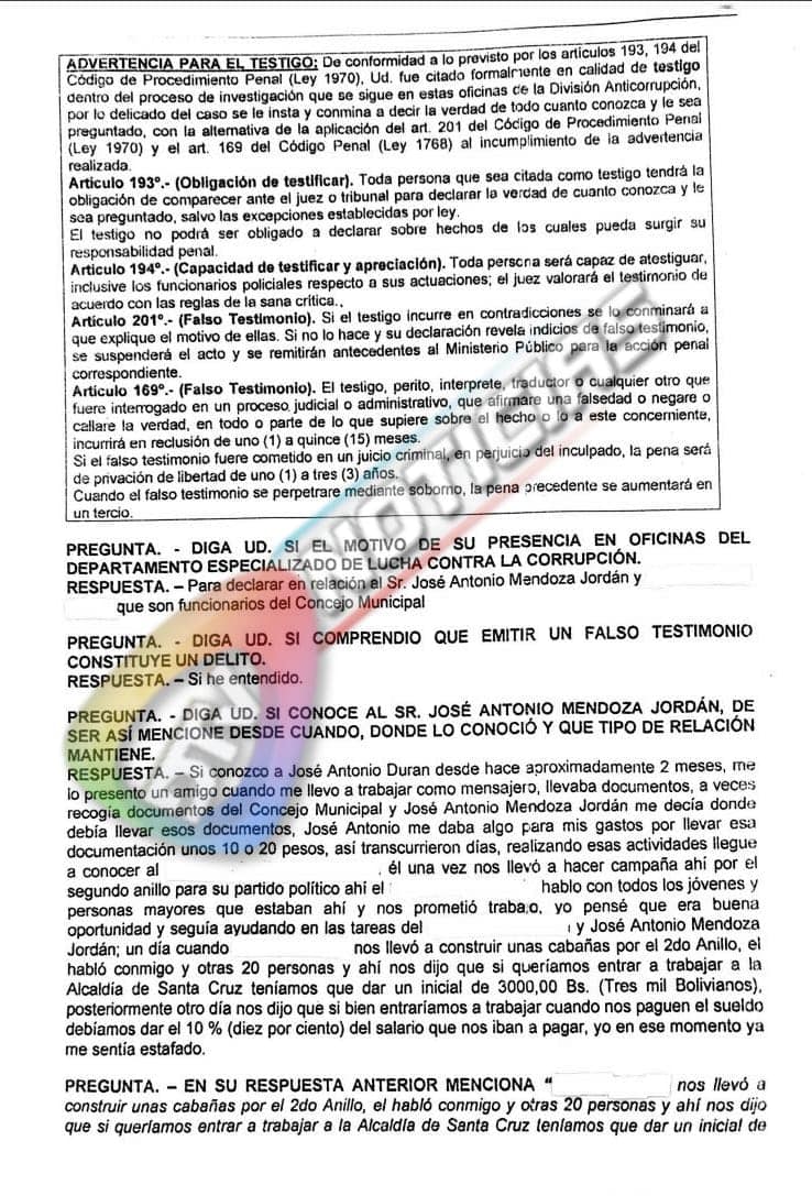 Los testigos indicaron que José Antonio Mendoza les exigía ese monto si querían continuar trabajando en la Alcaldía de Santa Cruz. Uno de los declarantes ante el Ministerio Público señalo que por no haber aportado fue retirado de la Alcaldía