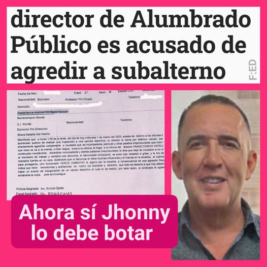 Un funcionario municipal 🗣️ denunció por lesiones graves y leves al director de Alumbrado Público, Franz Coscío. Ya es hora de que Jhonny lo apoye.
