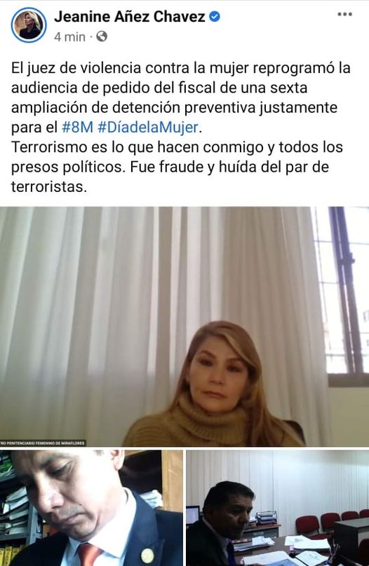 La expresidenta, Jeanine Añez, a través de sus redes sociales informó que el juez de violencia contra la mujer reprogramó la audiencia de pedido del fiscal de una sexta ampliación de detención preventiva para el 8 de marzo.
