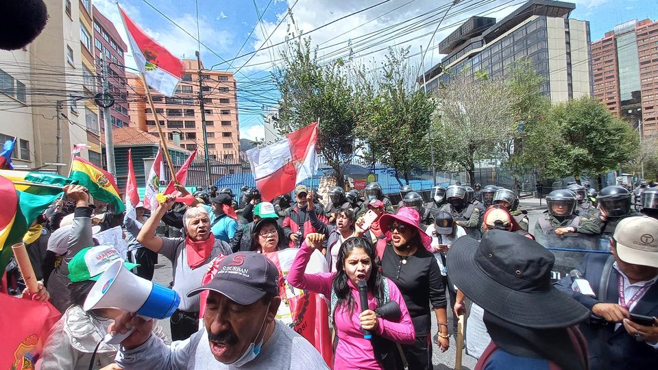 Los maestros de diferentes departamentos protestan en puertas del ministerio de educación exigiendo la liberación de los maestros que fueron detenidos durante el desbloqueo de la zona de la portada y la autopista La Paz – El Alto.