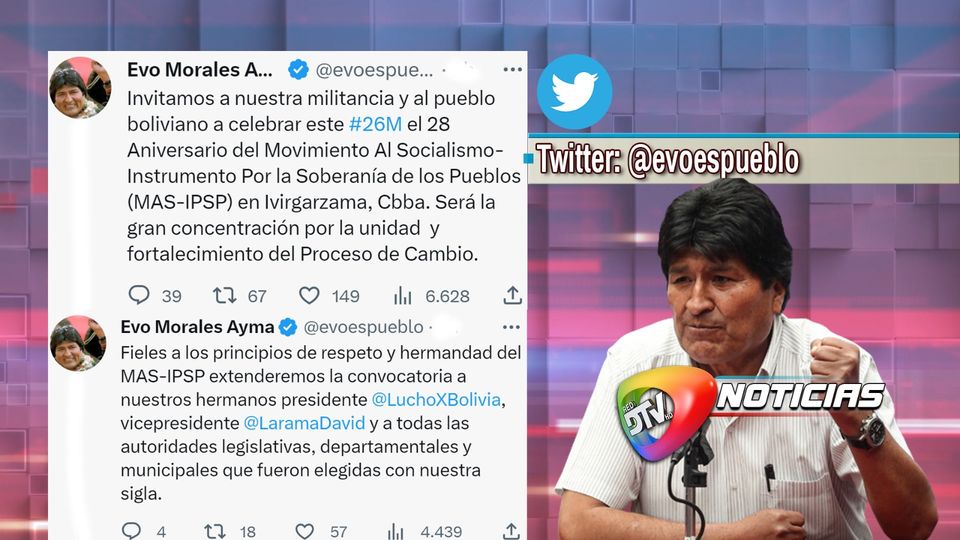 Evo Morales, ratifica en su ceunta en twitter invitación al presidente del Estado Plurinacional Luis Arce al acto de celebración de los 28 años de aniversario del MAS IPSP este 26 de marzo en Ivirgarzama-Cochabamba.