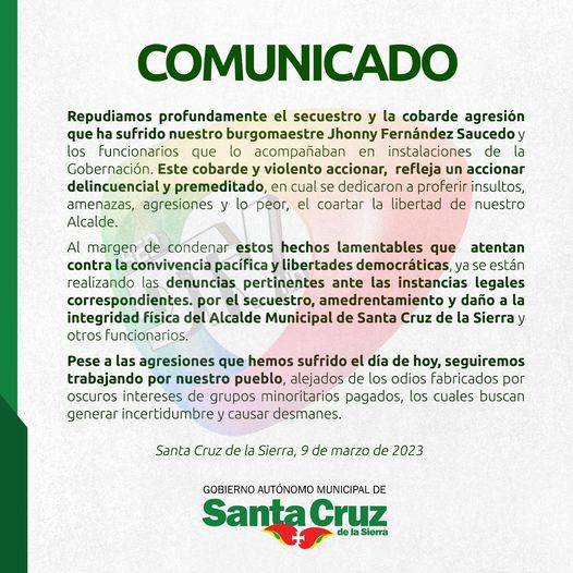 Municipio cruceño emite Comunicado oficial de rechazo a las agresiones contra el alcalde Fernández