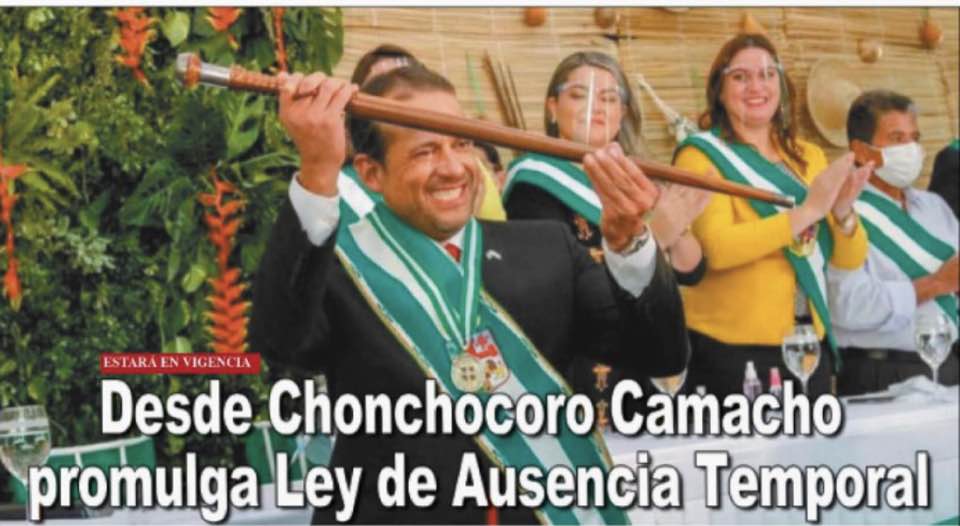 Camacho, legalmente gobernador. Ayer promulgó la ley que lo avala para seguir gobernando desde Chonchocoro