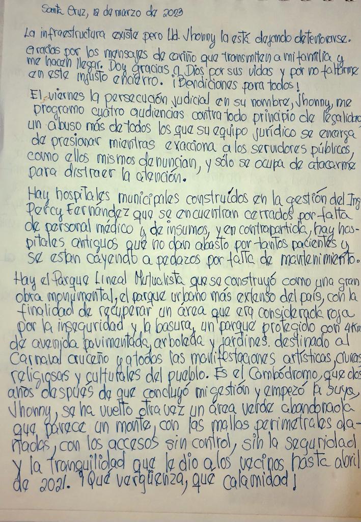 Angélica Sosa, en una nueva carta que escribió desde el penal de Palmasola culpó al alcalde de Santa Cruz, Jhonny Fernández, por el deterioro de las obras en Santa Cruz.