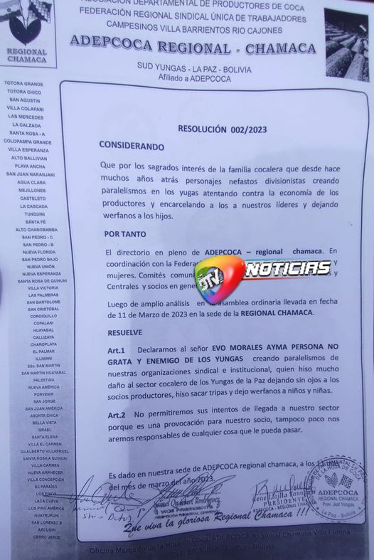 Mediante una resolución de la dirigencia de ADEPCOCA regional Chamaca, cuestionaron la persecución política que se realizó a esa entidad durante el gobierno de Evo Morales, por lo que ratificaron declararlo cómo enemigo de los Yungas, tras que no se haya permitido su paso por esa región.