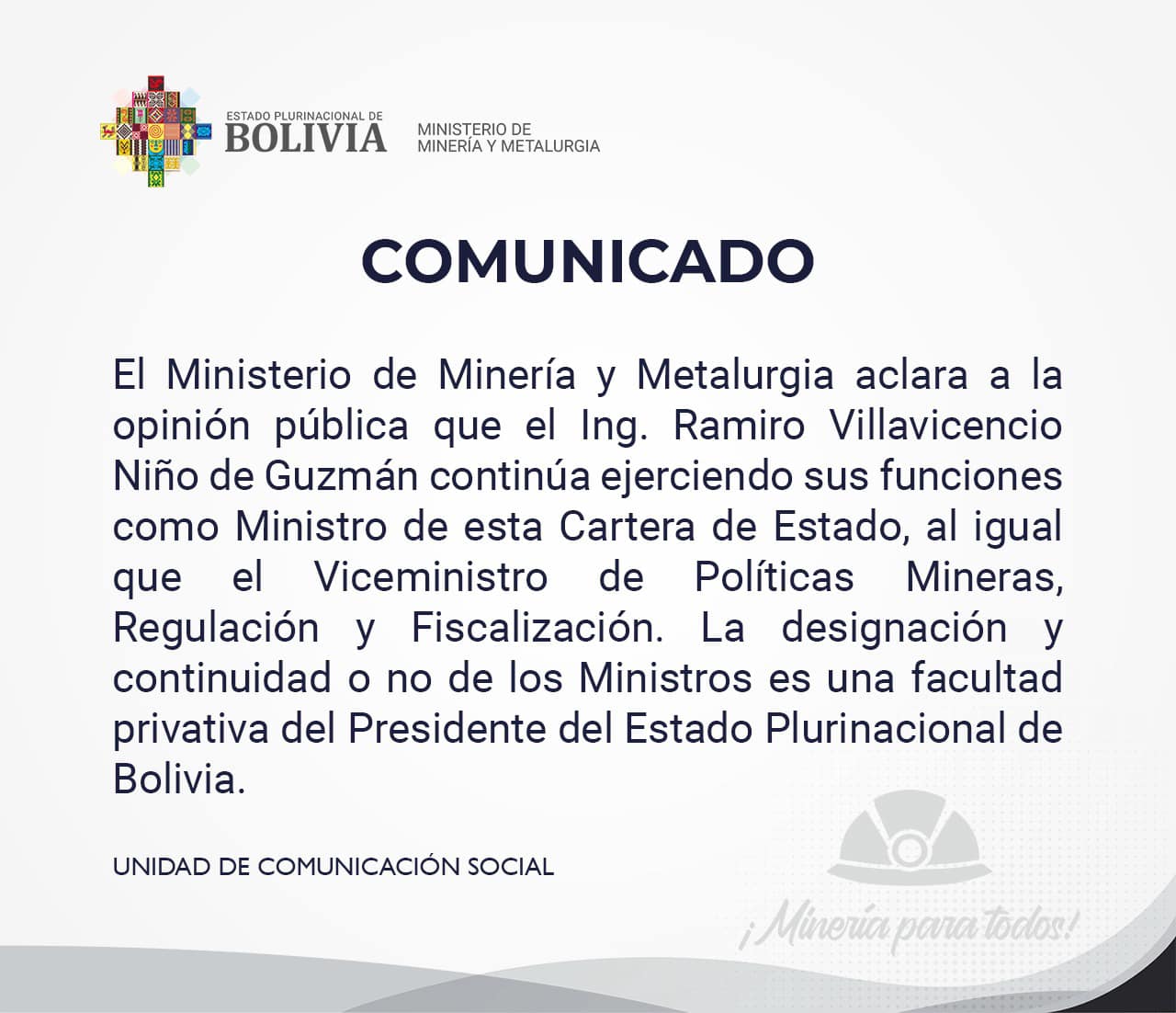 Gobierno niega la renuncia del Ministro de Minería y Metalurgia y aseguran en un comunicado que el Ing. Ramiro Villavicencio continúa ejerciendo el cargo al igual que el Viceministro.