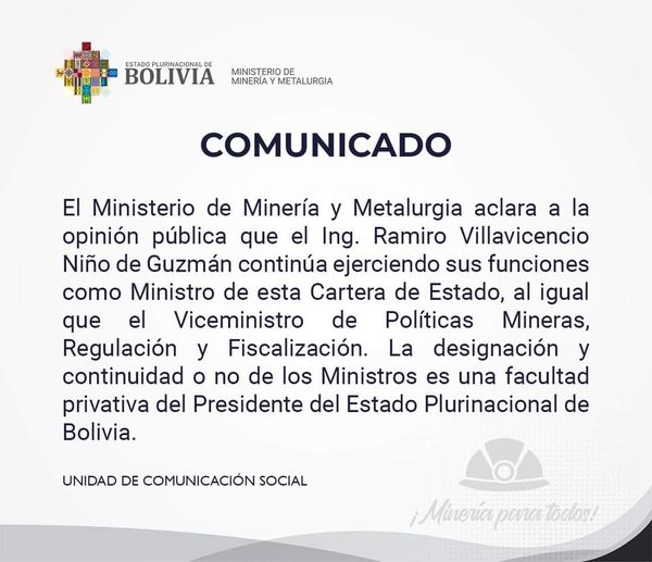 Ante versiones de una supuesta renuncia al cargo de Ministro de Mineria y Metalurgia el Sr. Ramiro Villavicencio, esa cartera de Estado emite un comunicado oficial desvirtuando tal situación y que la aludida autoridad sigue en el ejercicio de sus funciones.