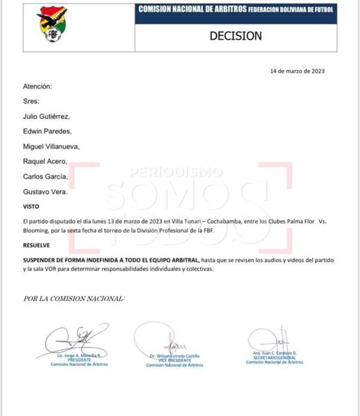 El cuerpo arbitral que dirigió el partido entre Blooming y Palmaflor están suspendidos indefinidamente hasta que se revisen los audios y videos del partido en la sala VOR.
