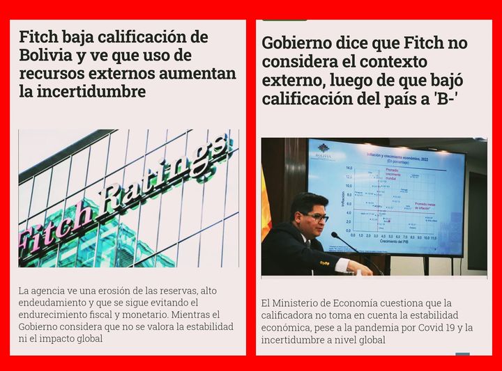 El Ministerio de Economía dice que si bien Fitch revisó la calificación de riesgo, el argumento de la variación de las Reservas Internacionales Netas (RIN) no consideró las fortalezas de la economía boliviana como la estabilidad económica que se logró luego de la pandemia Covid-19 y la actual incertidumbre de la economía a nivel global. F:ED