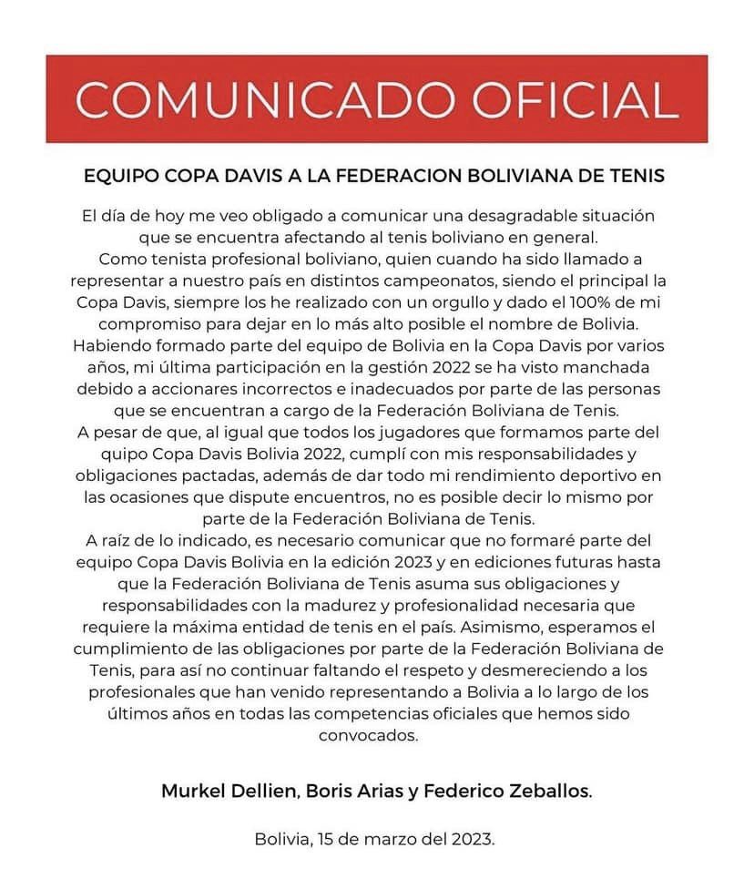 Equipo Boliviano de Tenis 🎾 👟 anuncia que no participará de la ‘Copa Davis 2023’ ni de ninguna otra versión futura hasta que la ‘Federación Boliviana de Tenis asuma obligaciones y responsabilidades con madurez…’