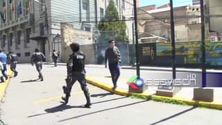 uniformados forman un cordón de seguridad en calles aledañas a la plaza Murillo, y usaron agentes químicos para dispersarlos en el centro Paceño le hicieron corretearonhttps://www.facebook.com/video.php?v=768367328246861