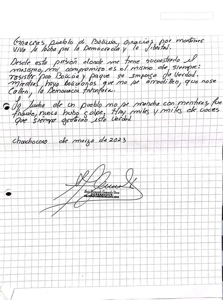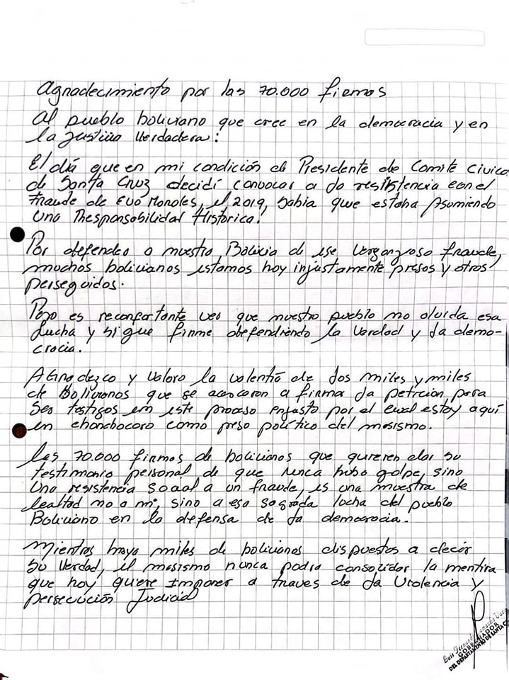 «Agradezco y valoro la valentía de los miles y miles de bolivianos que se acercaron a firmar la petición para ser testigos en este proceso injusto por el cual estoy aquí en Chonchocoro como preso político del masismo. Desde esta prisión donde me tiene secuestrado el masismo mi compromiso es el mismo de siempre resistir por Bolivia y porque se imponga la verdad.