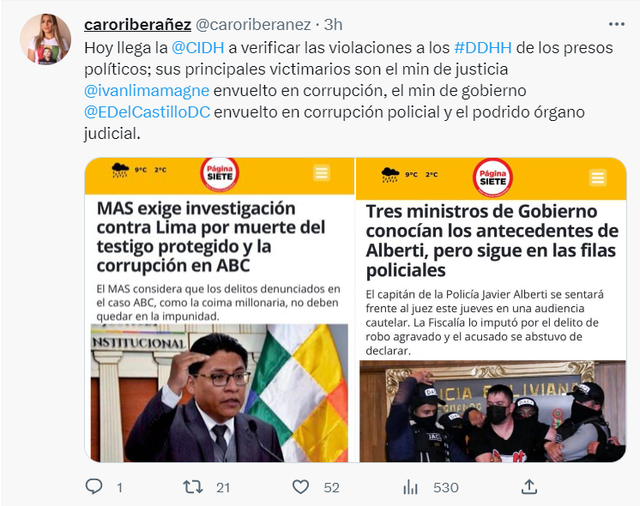 La hija de Jeanine Añez, Carolina Ribera, alude en su cuenta twitter a autoridades