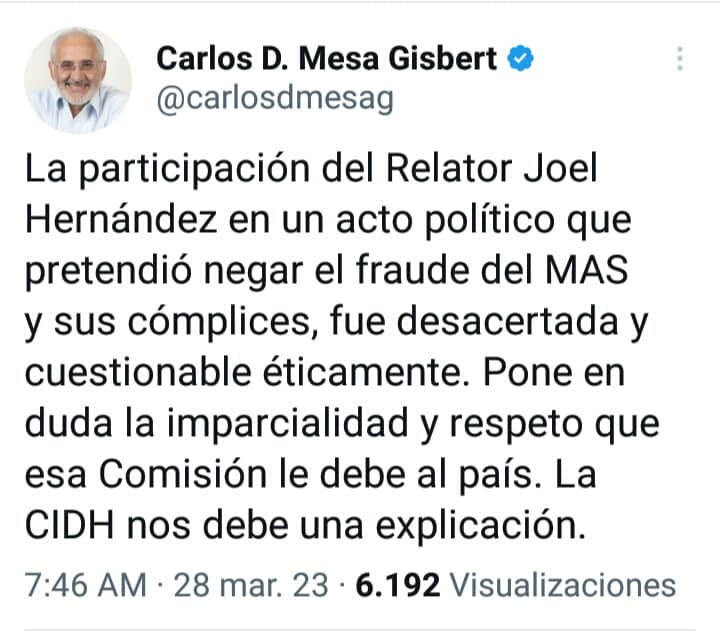 Mesa dice que participación de la #CIDH en acto político que «pretendió negar el fraude del MAS» pone en duda su imparcialidad y respeto al país