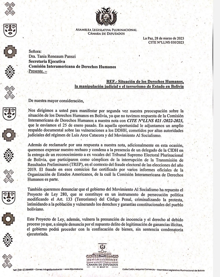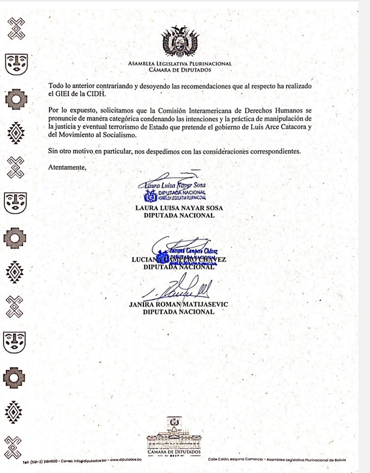 «Queremos expresar nuestro rechazo y condena a la presencia de un delegado de la CIDH en la entrega de un reconocimiento a ex vocales del Tribunal Supremo Electoral Plurinacional de Bolivia, que participaron como cómplices de la interrupción de la Transmisión de Resultados Preliminares (TREP), en el contexto del fraude electoral de las elecciones del año 2019. El fraude en esos comicios fue certificado por varios informes oficiales de la Organización de Estados Americanos, de la cual la Comisión Interamericana de Derechos Humanos es parte», señalan las diputadas de Comunidad Ciudadana Luisa Nayar, Luciana Campero y Janira Roman.