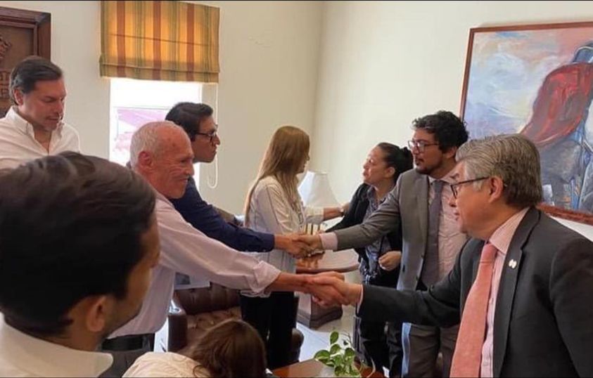El papá de Camacho se estrecha la mano con Joel Hernández, el miembro de la CIDH que avala la versión que no hubo fraude el 2019 en Bolivia.