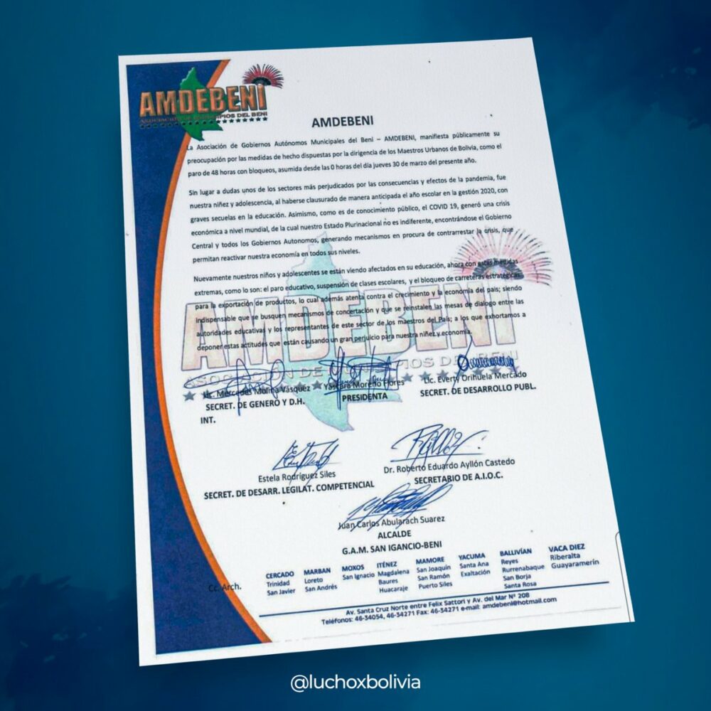 Con trabajo, unidad y esfuerzo logramos recuperar el derecho a la educación para nuestras y nuestros estudiantes. No pongamos en riesgo todo lo que hemos avanzado. Hacemos eco de la preocupación y reflexión de la Asociación de Gobiernos Autónomos Municipales del #Beni. https://t.co/Ec8ZPz0TV7
