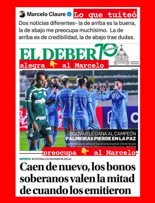 LA ECONOMÍA PREOCUPA AL MECENAS DEL BOLIVAR 🛡️ La noticia 📺📻🎙️ de la caída del precio de los bonos bolivianos, encendió las alarmas 🚨 de un poderoso de la economía. Si sumamos a ello, que el BCB 🏦 no reporta hasta ahora el informe estadístico de las reservas 💰 internacionales, tenemos un escenario nefasto -económicamente hablando- para 🇧🇴 El BCB y el gobierno, saben que el momento que se haga pública esa información estadística 📈📉, se va a calentar 🔥 en serio el ambiente. Por eso se esconde 😶🌫️ la información; no es que se le mienta; se OCULTA la información que debería ser pública, dejando en total estado de incertidumbre al ciudadano 🧘 Lo poco de información económica 💻 se conoce de Bolivia, viene desde afuera y generada por organizaciones e instituciones que analizan minuciosamente cada aspecto económico del país. Y pese a todo ello, con un cinismo monumental, prefieren negar todo 🤹