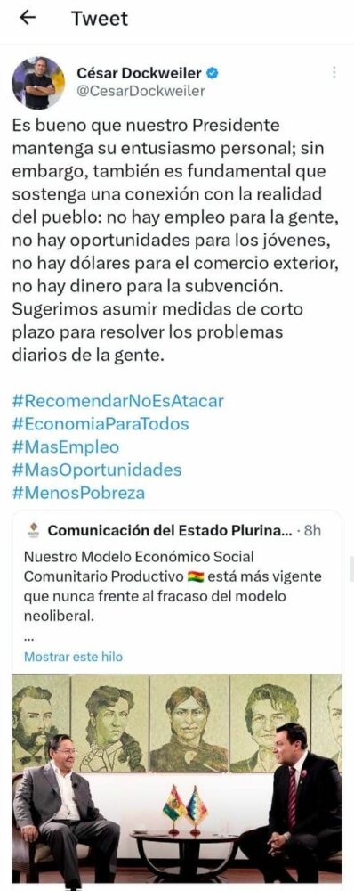 Dura y sorpresiva crítica de César Dockweiler al presidente Luis Arce. “Es fundamental que sostenga una conexión con la realidad del pueblo”, dice el ex candidato a alcalde de La Paz (derrotado por Iván Arias) y ex encargado de los teleféricos, de la línea Evista.