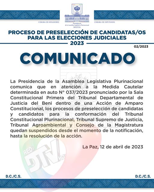 El presidente de la comision de constitucion de diputados, Juan Jose Jauregui (MAS) informó que debido a una medida cautelar que se presentó en la Sala Constitucional Primera del Tribunal Departamental de Justicia del Beni se suspende momentaneamente la recepción de postulantes al Órgano Judicial, mientras no se resuelva la medida cautelar, por lo que tendrá que reprogramarse la recpecion de postulaciones.