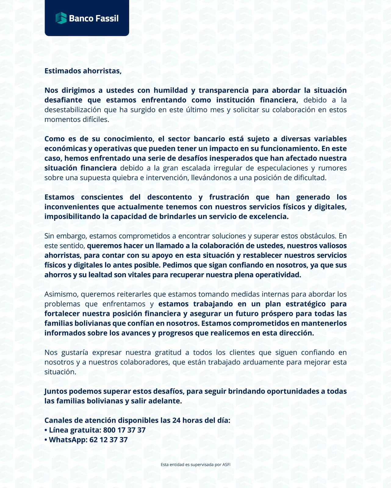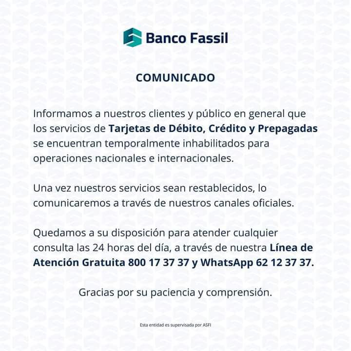 Tarjetas de débito, Crédito y Prepagadas de Banco Fassil, inhabilitadas temporalmente para operaciones nacionales e internacionales, informa a sus clientes en un comunicado oficial la entidad financiera.