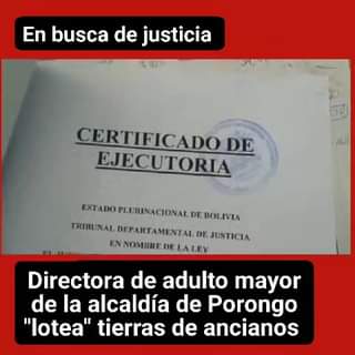 AMENAZA A ANCIANOS CON METERLOS A LA CÁRCEL 🙋🏼♀️María Elena Osinaga usando su poder desde su cargo en la alcaldía de Porongo que le dió Neptaly Mendoza no solo quiere quitarle sus tierras a don Gabriel Taborga y su esposa sino que además los amenaza «les dijo que los iba a meter a la cárcel», contó llorosa la nuera de los viejitos. 🔎María Elena Osinaga se mueve con tal impunidad que ya comenzó a meter albañiles y levantar una barda en tierras ajenas. ♨️La Directora del adulto mayor de Porongo aseguró que el juez mixto de La Guardia recibió coima para dar a favor de los ancianos, «Le mostramos el fallo del juez que da usucapión a favor de don Gabriel Taborga pero dijo que habíamos pagado coima», aseguró la nuera. Incluso hasta un careo cara a cara hubo entre los ancianos y María Elena Osinaga cuando los concejales del municipio de Porongo estuvieron en las tierras loteadas por la funcionaria, pero María Elena calló.