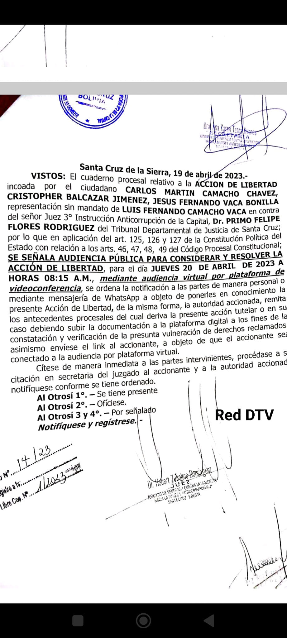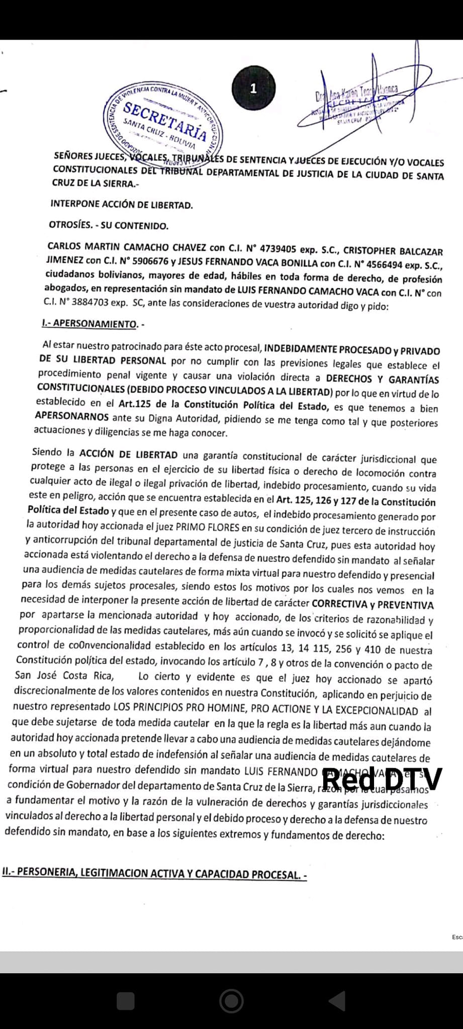 Gobernador Luis Fernando, Martin Camacho, en la que se solicita que la autoridad participe de forma presencial en la audiencia cautelar fijada para mañana a las 8 am y no así de manera virtual.A su vez piden la recusación del juez Primo Flores, por no convocar en igualdad de condiciones a las partes a una audiencia presencial, sino, que fue fijada de forma ‘mixta’, permitiendo que la autoridad solo participe de manera virtual violando los principios de ‘oralidad e inmediatez’ reza la acción legal.