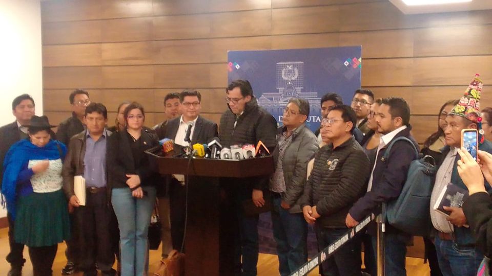 Presidente de Diputados, Ministro de Economía y presdiente del BCB anunciando la aprobacion de Ley del y remisión al Senado