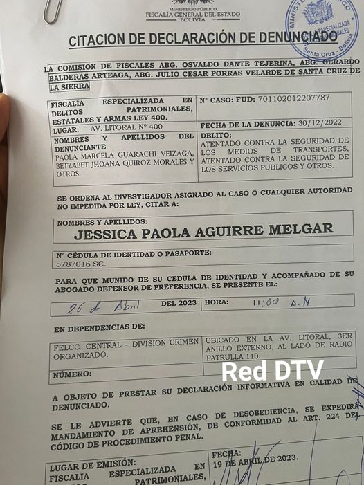 Una comisión de fiscales emitió una citación para la Asambleista departamental Paola Aguirre por los delitos de atentado contra la seguridad de los medios de transportes, atentado contra la seguridad de los servicios públicos y otros para el próximo miércoles 26 de abril a las 11:00 am en instalaciones de la Felcc.
