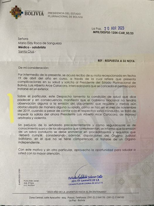 Eidy Roca, que reuna todos los requisitos ante la Justicia al tratarse de un Órgano independiente y que no tendría el gobierno ninguna observación y menos obstaculizaria su salida a recibir atención médica especializada en el exterior, como solicita.El gobierno está dispuesto a emitirle el documento (Salvo conducto) que requiere la ex ministra, recordandole no solo que debe cumplir primero con los requisitos, sino tambien de cómo se trató de impedir la salida de forma arbitraria y violenta del ahora presidente del Estado en noviembre del 2019, pese a tener el salvo conducto, reza la nota de respuesta a la ex ministra de Jeanine Añez.