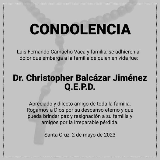 Camacho expresa sus condolencias a la familia de su abogado Christopher BalcázarCategorías NoticiasEtiquetas 02/05/2023 [vid_embed] Fuente: DTV